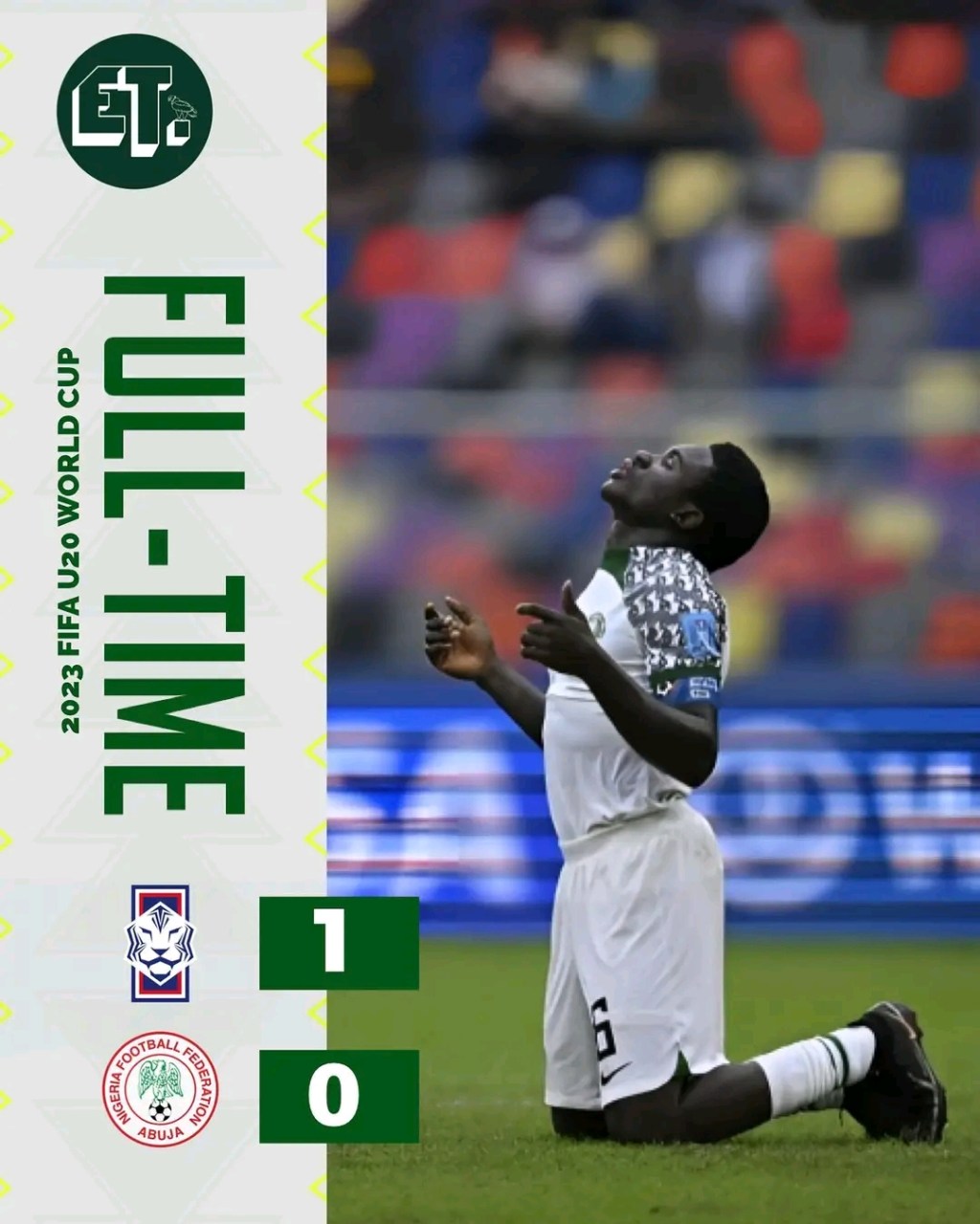 An fitar da tawagar kwallon ƙafar Najeriya ƴan ƙasa da shekara 20 daga gasar cin kofin duniya ta FIFA da ke gudana a kasar Argentina sakamakon karin lokaci da aka samu, wanda nan take koriya ta shiga gabanta, kuma suka kasa warware wannan kwallo daya.