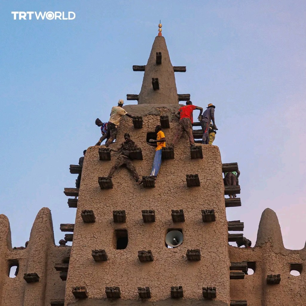 A yayin wani biki na shekara-shekara da ake kira ‘Crepissage,’ dubban dubbai ne suka taruwa don gyarawa da kuma ƙarfafa tsarin da aka gina masallaci mafi girma a duniya wanda aka gina da ƙasa wato (Laka) kafin lokacin damina a watan Yuli da Agusta.
