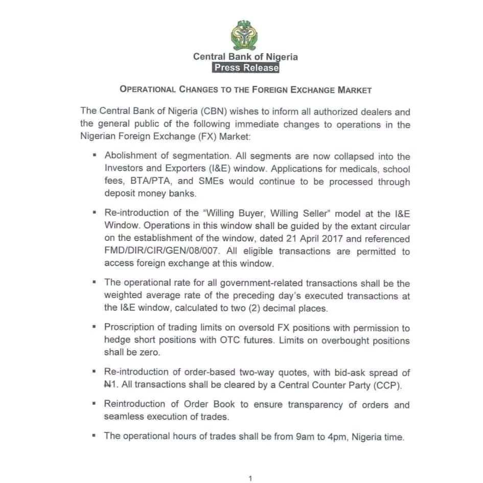 Babban bankin ya dauki wannan mataki ne a matsayin wani sauye-sauyen da ake yi a kasuwar hada-hadar kudi ta Najeriya (FX), matakin da zai inganta harkokin kudi da kwanciyar hankali.